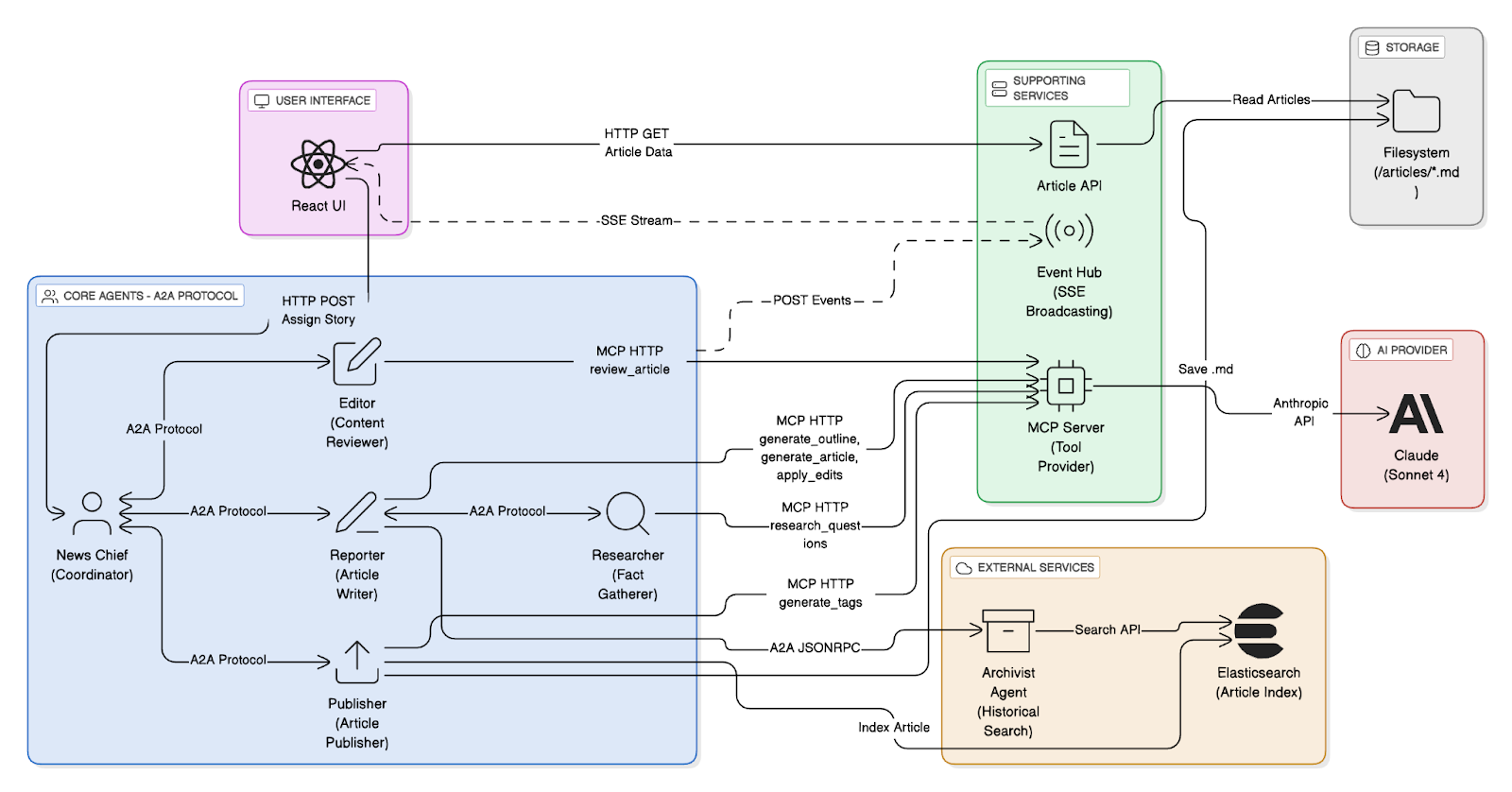 These agents don't work in isolation; when the News Chief assigns a story about renewable energy adoption, the Reporter needs the Researcher to gather statistics, the Editor to review the draft, and the Publisher to publish the final piece. This coordination happens through A2A protocols.