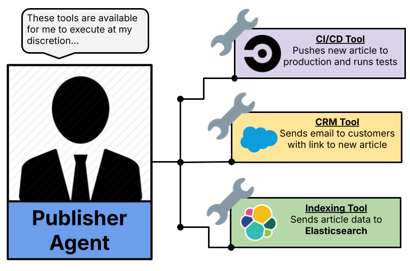 In our newsroom example, individual agents use MCP servers to access the tools and data they need: