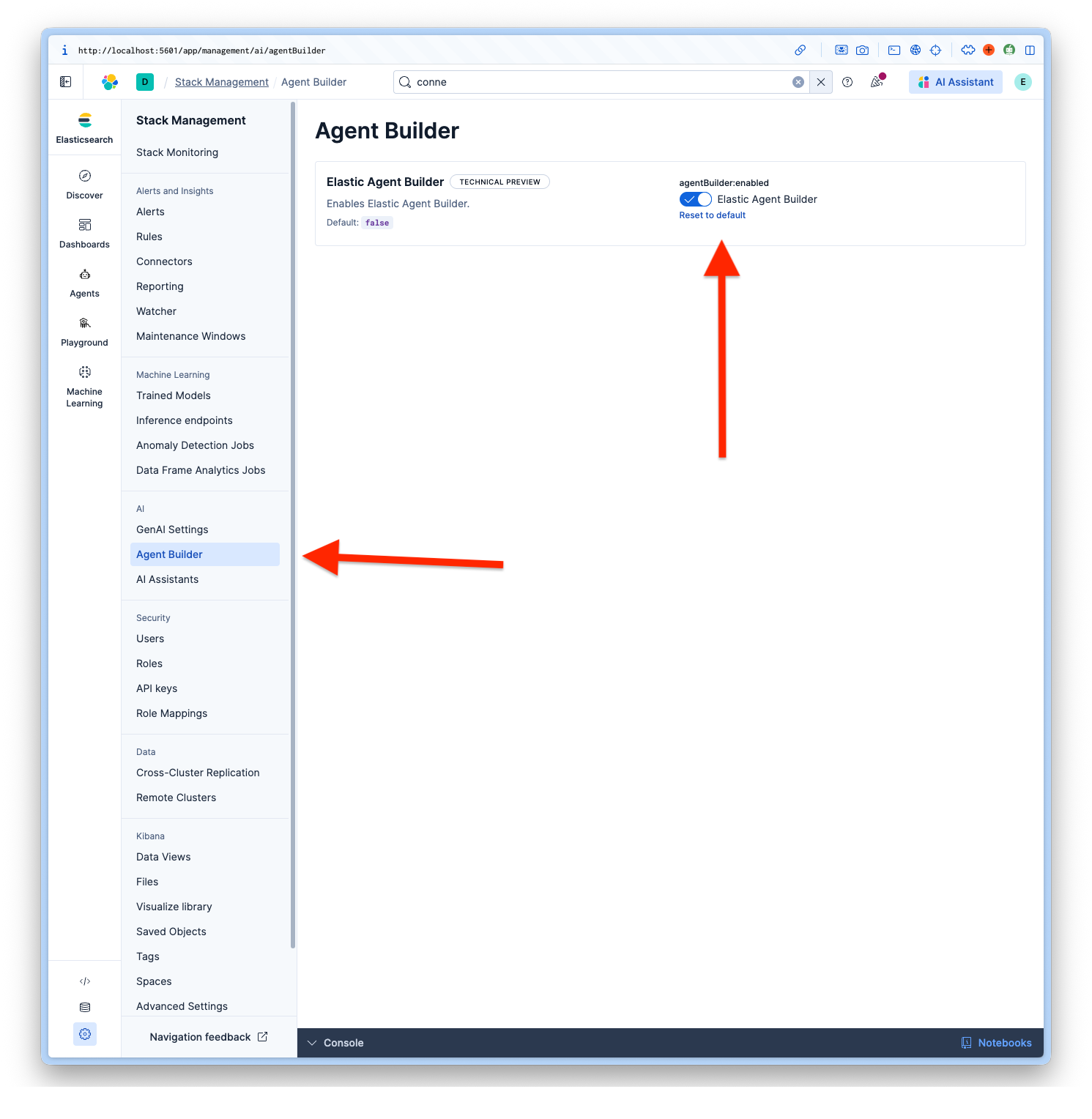 Once logged in to Kibana, navigate to Management > AI > Agent Builder and activate the Agent Builder.