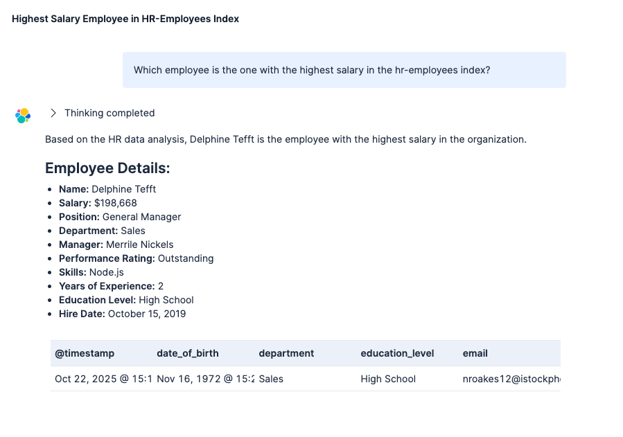 GET hr-employees/_searchStep 5: Build and test your AI agent