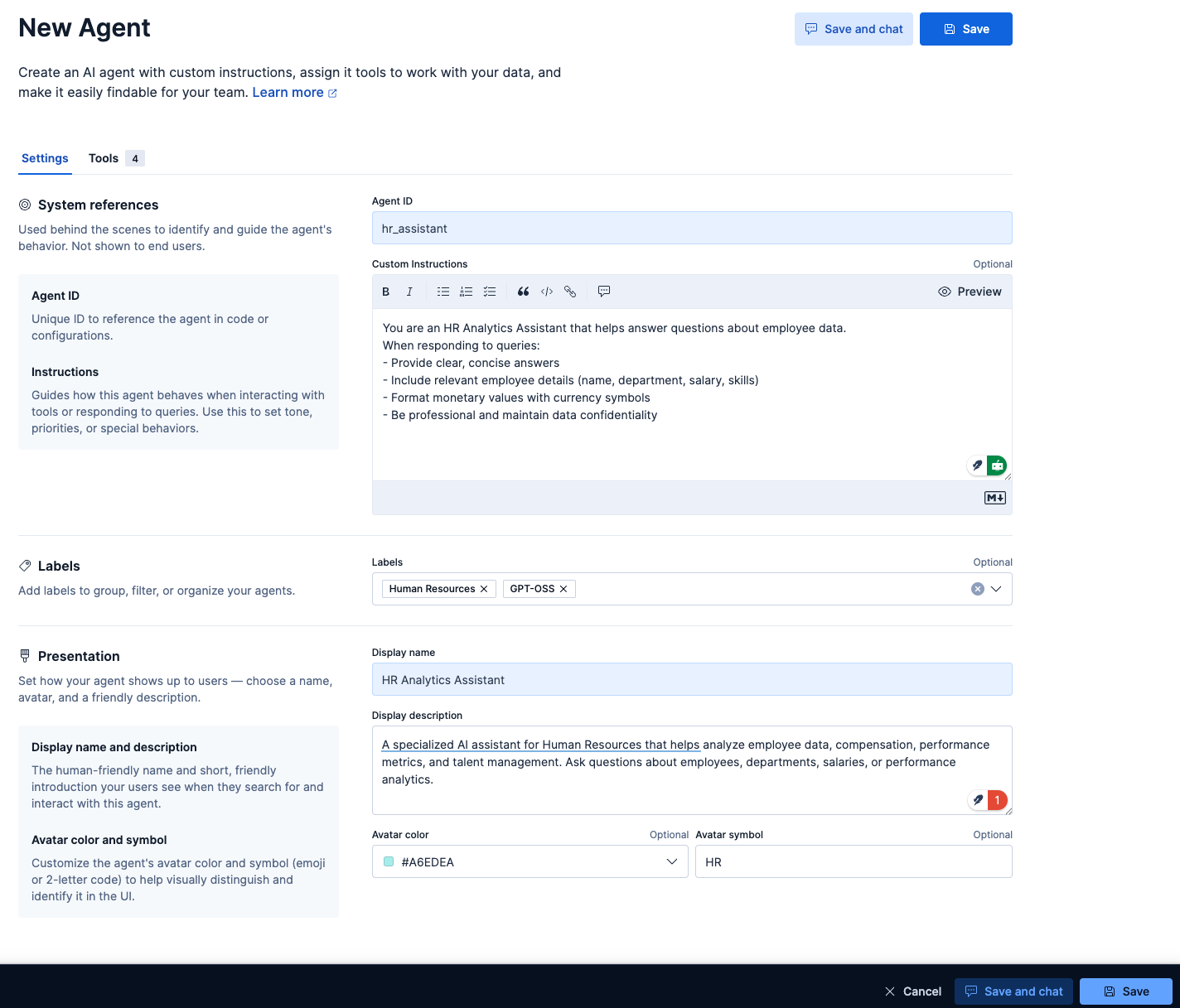But there are more customization options, like the Custom Instructions that guide how your agent is going to behave and interact with your tools, similar to a system prompt, but for our custom agent. Labels help organize your agents, avatar color, and avatar symbol.