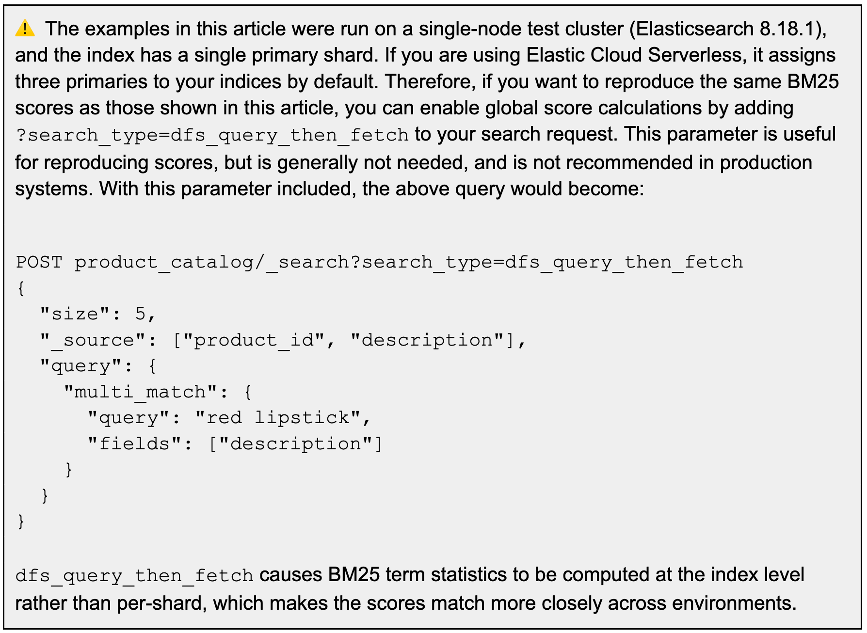 }This returns a pure BM25 ranking (without any cohort boosting). In this example, the scores of LIP-001 and LIP-002 will be very close (or identical), because they match the same query terms with similar frequencies and have comparable lengths.