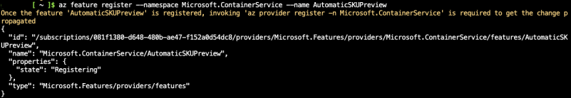 az feature register --namespace Microsoft.ContainerService --name AutomaticSKUPreviewYou will see the details about the feature subscription we just created: