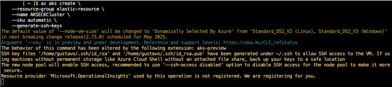 --generate-ssh-keys* If you get MissingSubscriptionRegistration errors, go back to step 4 with the missing subscriptions. For example, The subscription is not registered to use namespace 'microsoft.insights' requires running az provider register --namespace Microsoft.Insights.