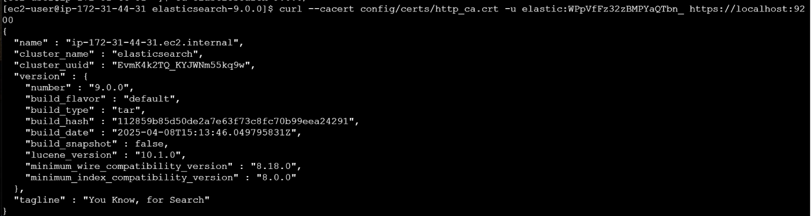 curl --cacert config/certs/http_ca.crt -u elastic:$ELASTIC_PASSWORD https://localhost:9200Replace $ELASTIC_PASSWORD with the generated password from step 3.