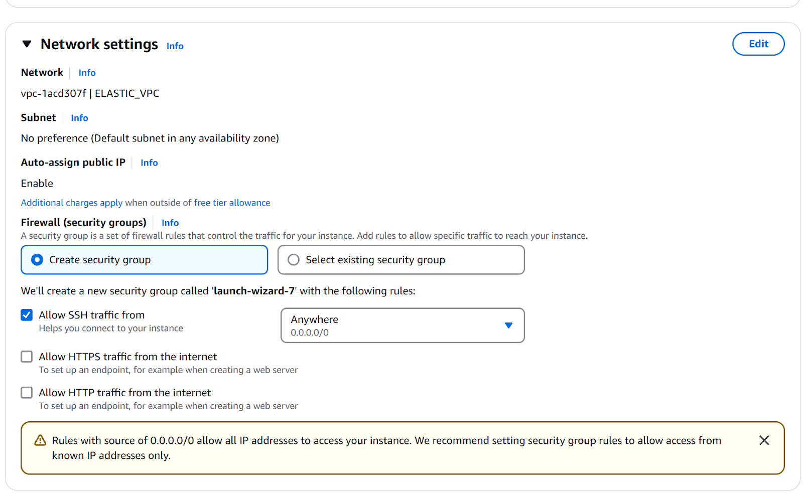 By default, EC2 blocks incoming traffic for security. To open Kibana in your browser, we need to allow traffic on port 5601. We are going to add an inbound rule so we allow traffic from any host (0.0.0.0/0).