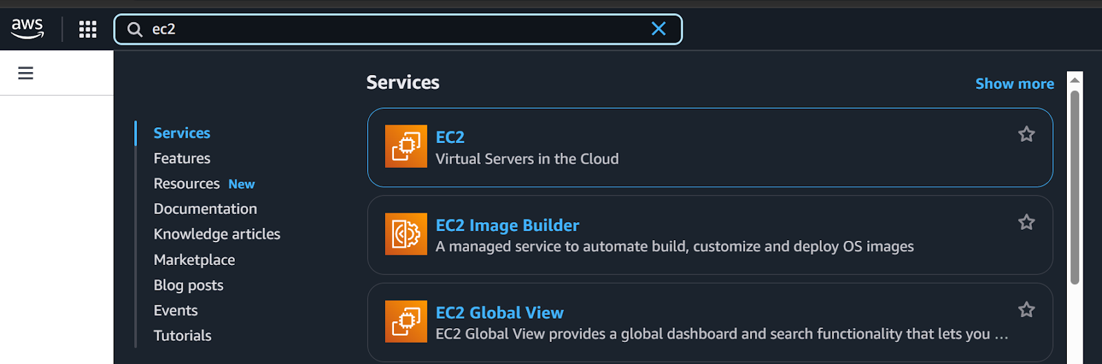 2. Search for EC2 in the search bar.