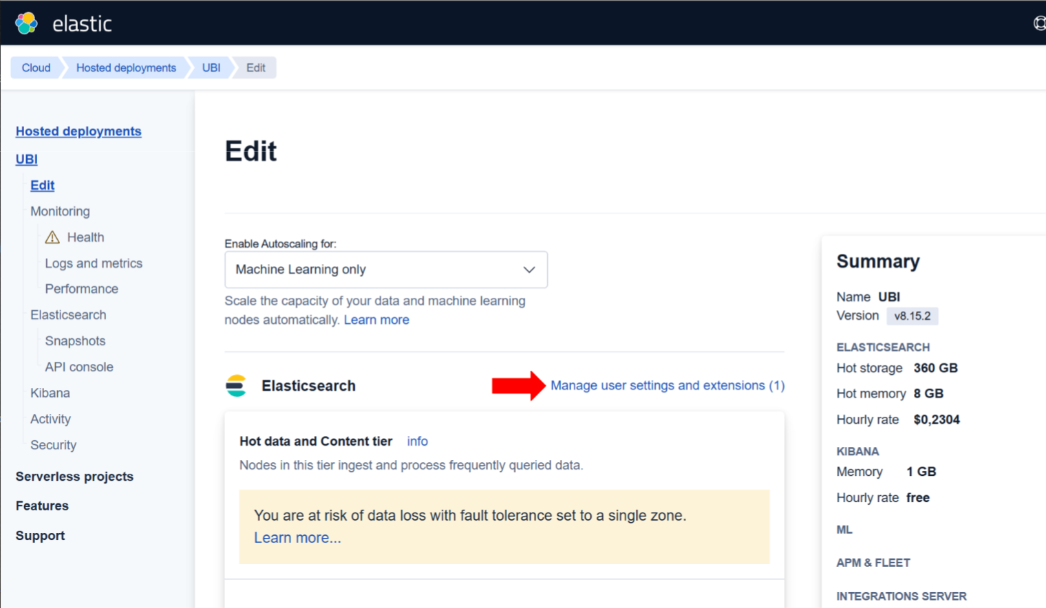 6. Under Elasticsearch, click the Manage user settings and extensions link