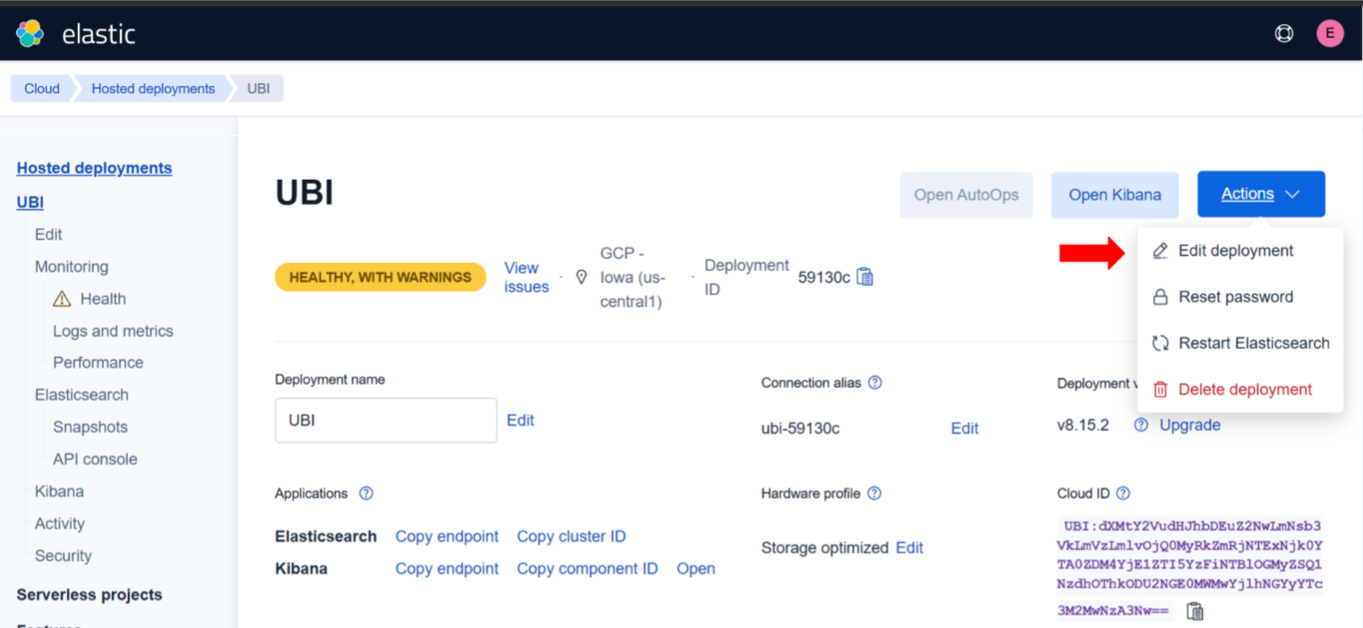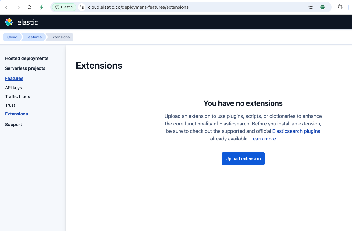 We are going to install the plugin on an Elastic Cloud instance. For self-managed deployments, you can follow the steps in the documentation.