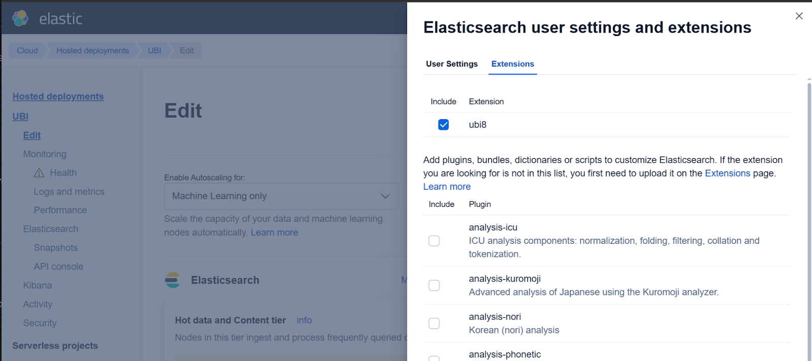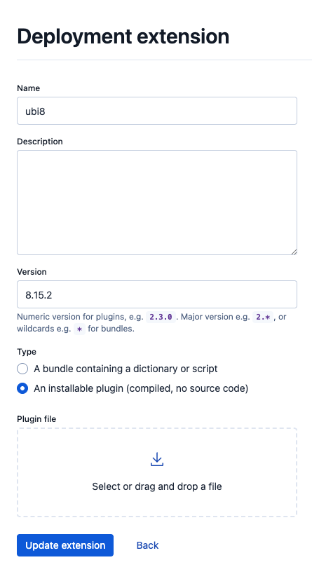 2. Click “Upload extension,” select the elasticsearch-ubi-1.0.0-SNAPSHOT.zip file, and fill in the details. At the time of writing, the plugin Elasticsearch version is 8.15.2, so you must use that version or compile for a different one. You can check the Elasticsearch version of the latest code of the plugin by looking at the gradle.properties file.