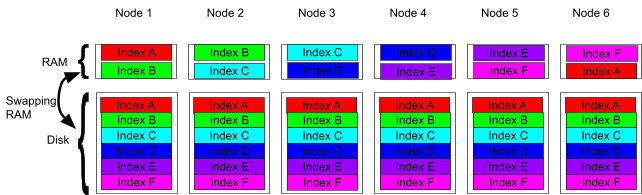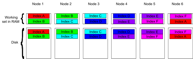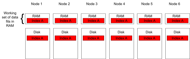 Diagram 1: High replica counts benefit a single, small, hot data set (one or more indices) that fits into RAM on all nodes. All queries hit cached data and throughput scales efficiently.