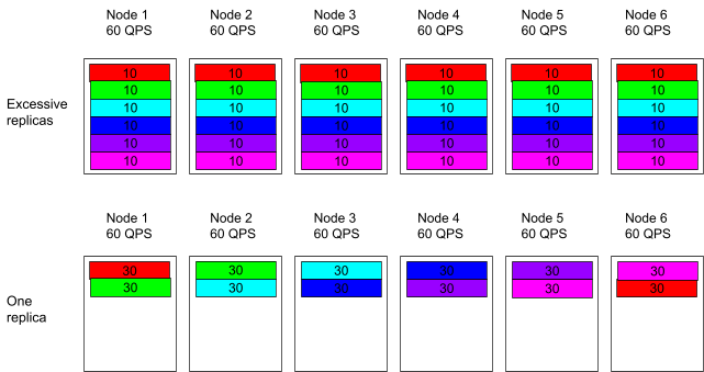 Diagram 5: Same query load, improved cache hits: Before and after reducing replicas