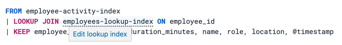 Intuitiver Workflow: Die umfassende Autovervollständigung von Discover führt Sie durch den Prozess, schlägt Suchindizes und Join-Felder im ES|QL-Editor vor und macht es unglaublich einfach, Ihre hochgeladenen Daten mit vorhandenen Indizes zu verbinden. Geben Sie den Namen eines Lookup-Index ein, der nicht existiert, und erhalten Sie mit einem Klick direkten Zugriff auf den Lookup-Editor, um den Index zu erstellen. Geben Sie den Namen eines bestehenden Nachschlageindex ein, und wir schlagen eine Option zur Bearbeitung vor: