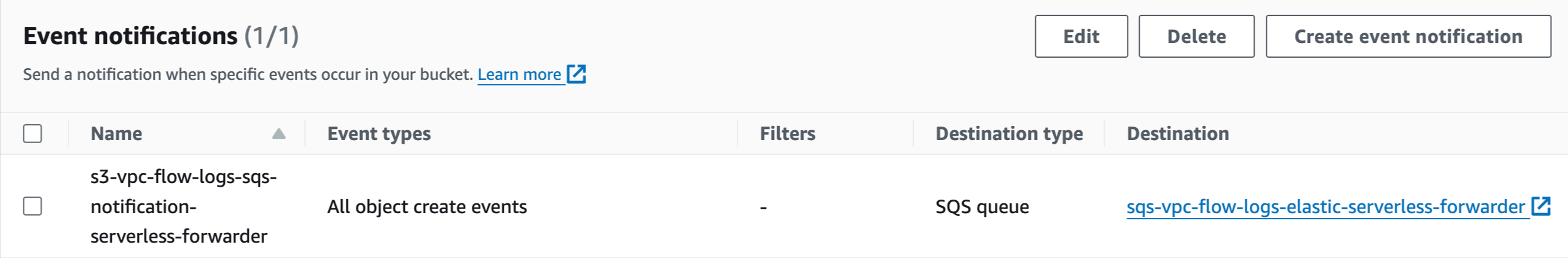 sqs-vpc-flow-logs-elastic-serverless-forwarder) in the same region as the S3 bucket. Set the Visibility Timeout to 910 seconds. Update the SQS Access Policy to allow the S3 bucket to send messages to the queue. Note the SQS ARN. - Configure S3 event notification: In the S3 bucket properties, create an event notification that triggers when objects are created. Set the destination to the SQS queue created earlier.