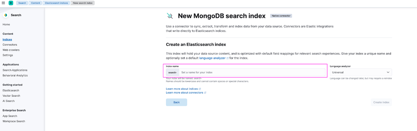 Give a name for your index under "Create an Elasticsearch index". Index name will be prefixed with search-