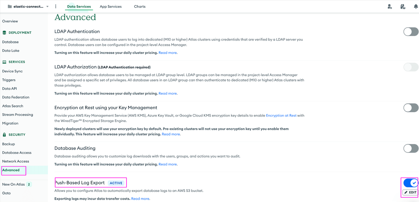 Note: Follow the prompts on MongoDB console to enable log export to S3