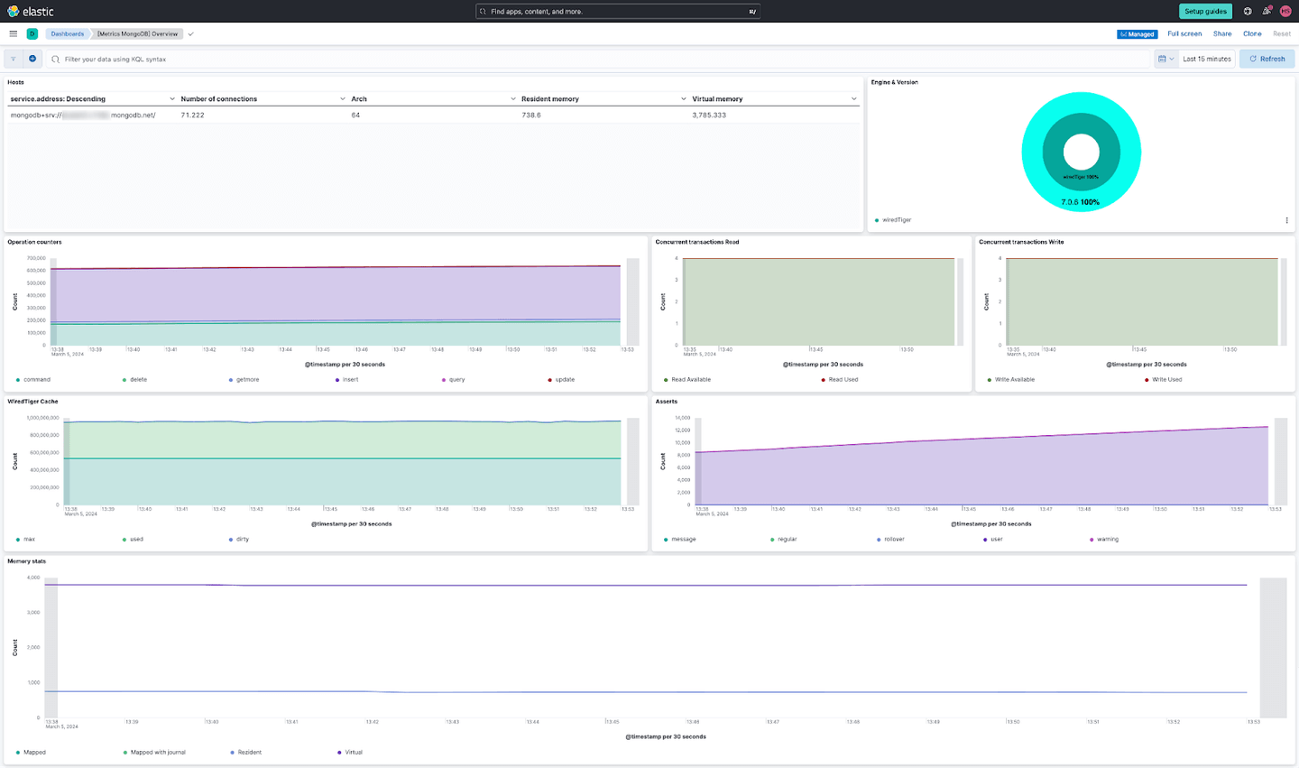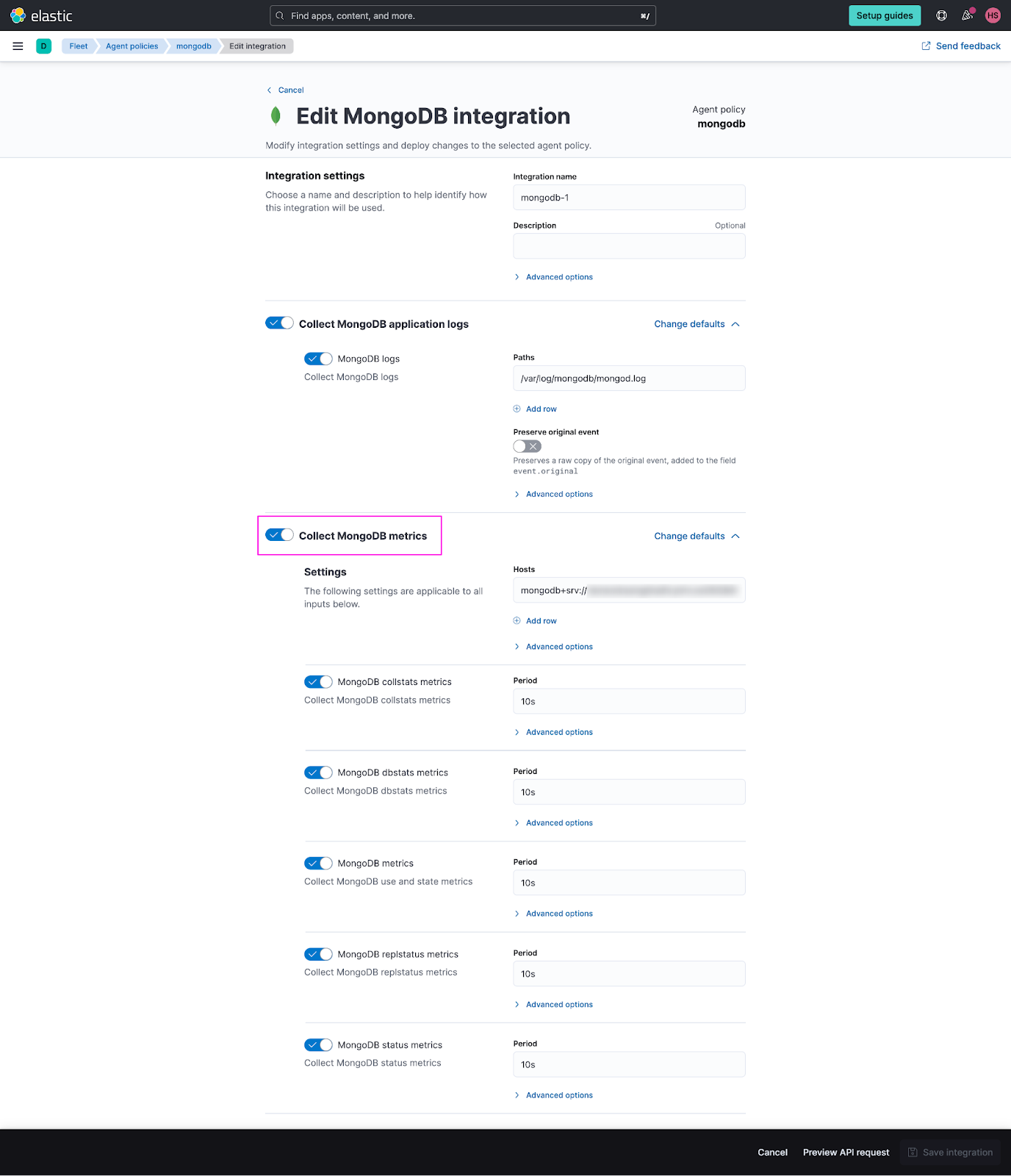 For ingesting metrics from the MongoDB Atlas cluster, we will use the Elastic MongoDB integration. At a high level use a fleet server (available by default) in Elastic Cloud and install an agent on a host (access required to MongoDB cluster, add host IP in Atlas Network access). MongoDB integration is configured and deployed on the agent which runs Metrics command on MongoDB server to ingest data into Elasticsearch.