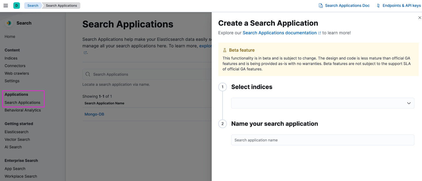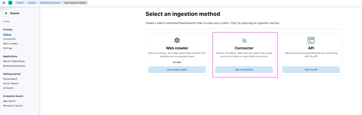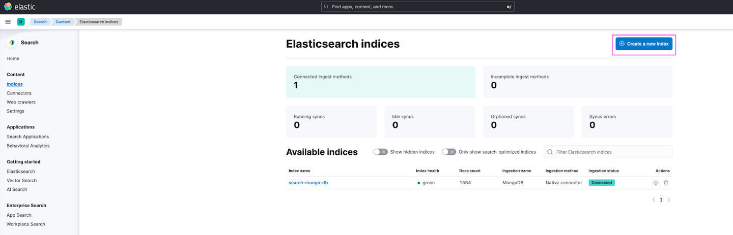 - Login to Kibana and go to Search -> Content -> Indices -> Create a new index.