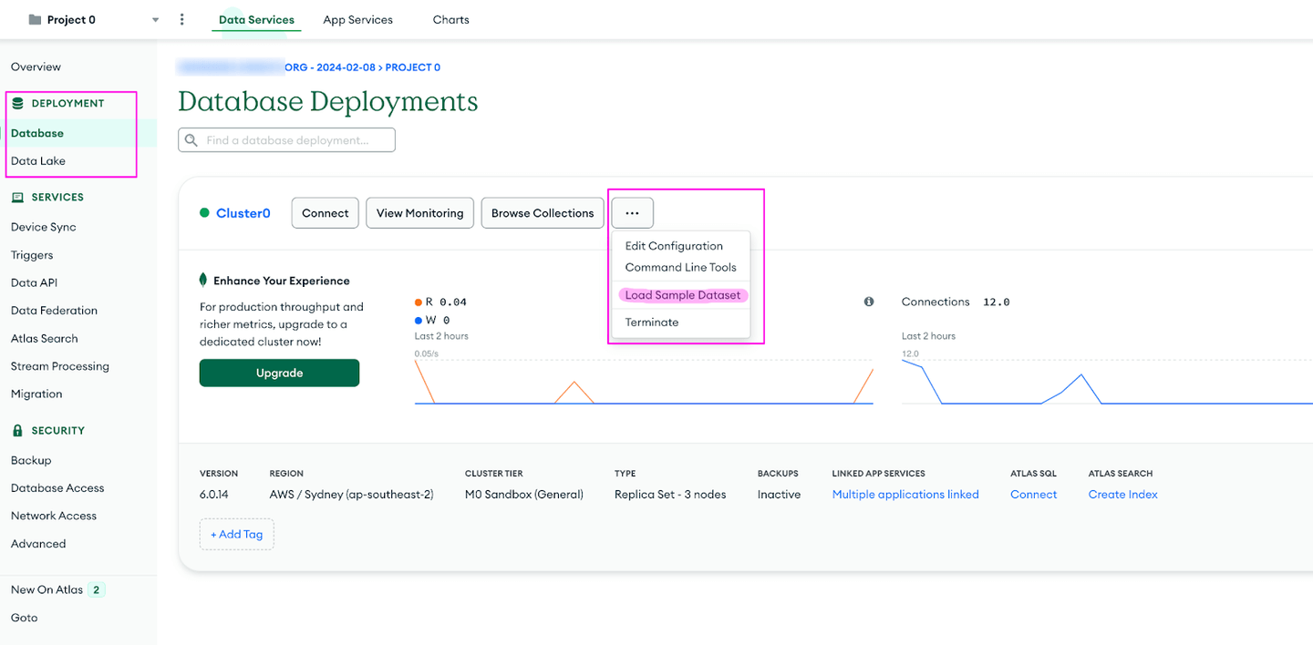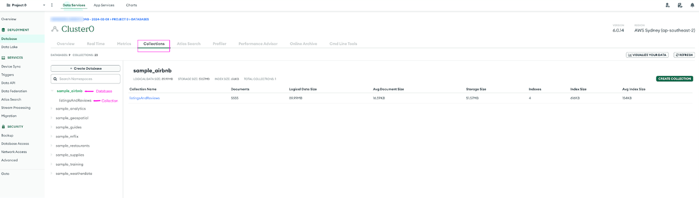 - Load sample data (available by default in MongoDB Atlas) to create a database or use your existing database and collection to be used later in connector configuration.