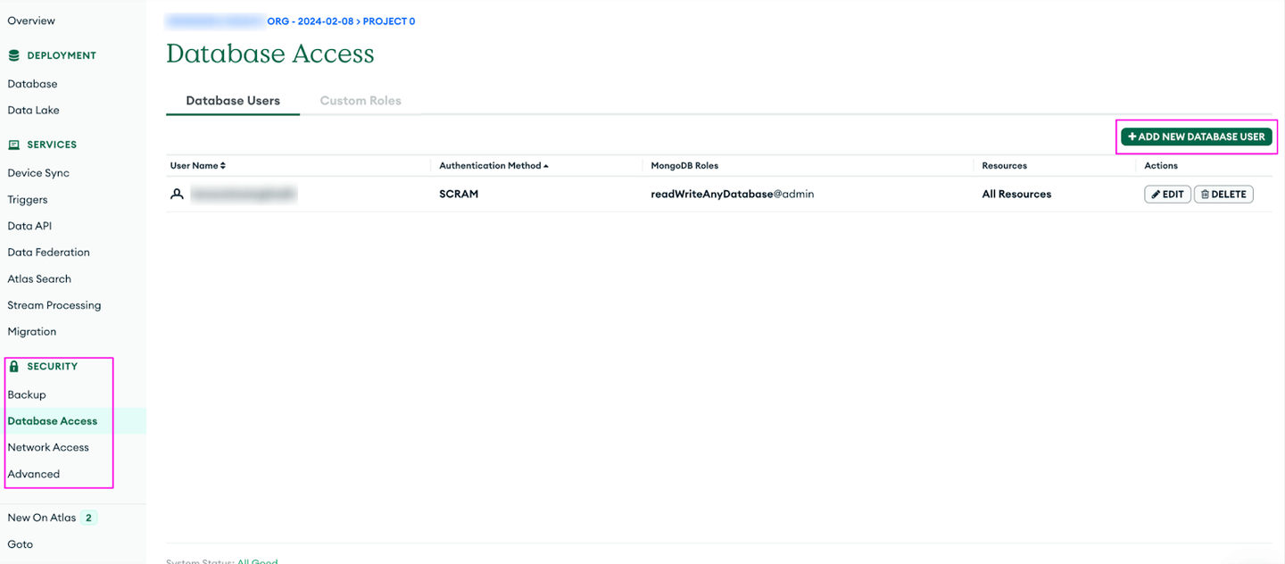 - Create a database user. User ID and password will be required to configure the connector. A read-only user with permission to access database and collection is sufficient. For testing I have used the default role.