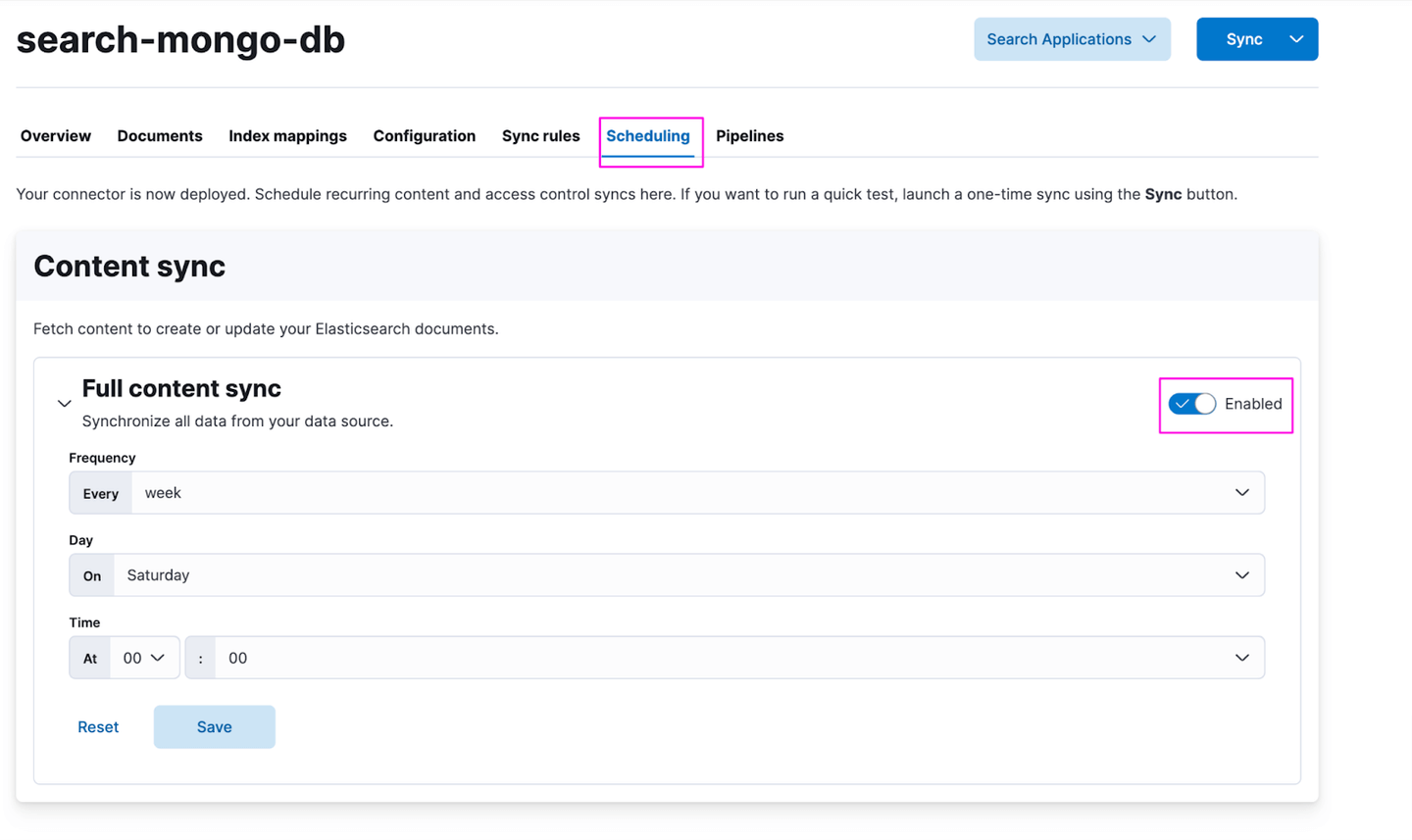 Once configuration is done successfully, click on the "Sync" button to perform the initial Full Content sync. For a recurring sync, configure the sync frequency under the Scheduling tab. It is disabled by default, so you'll need to toggle the Enable button to enable it. Once scheduling is done, the connector will run at configured time and pull all the content from the MongoDB database and specified collection.