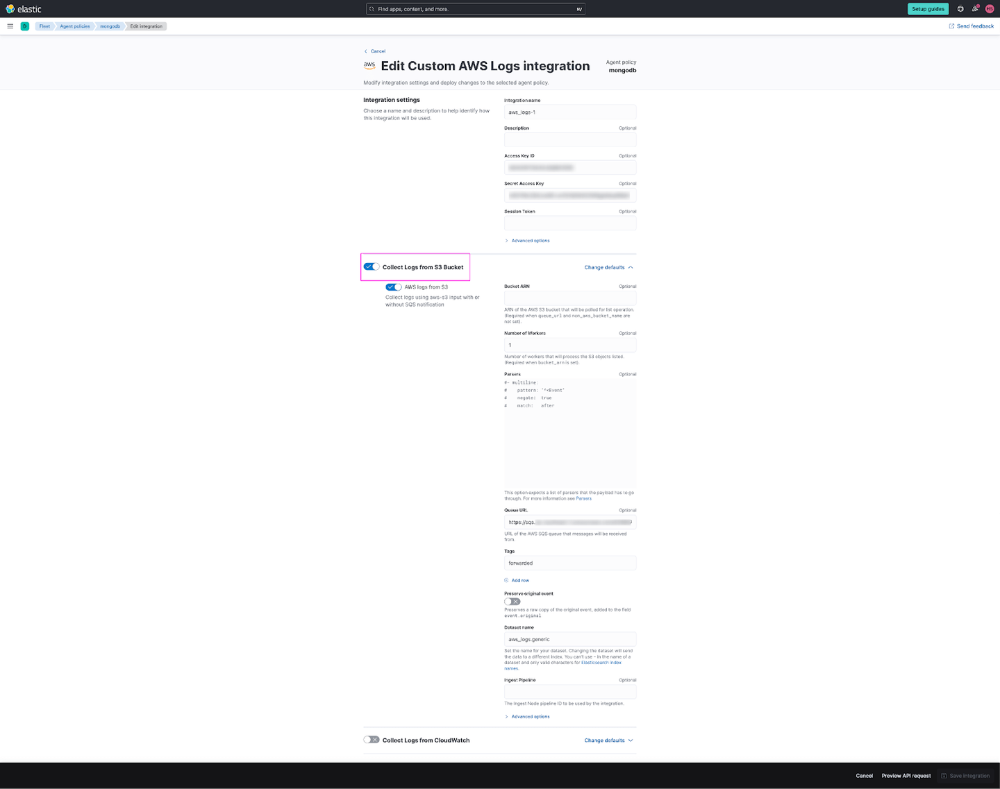 Toggle on “Collect Logs from S3 Bucket” in Custom AWS Logs integration and provide either AWS S3 bucket ARN configured to get MongoDB logs or SQS queue URL. SQS method is recommended as polling all S3 objects is expensive, instead integration can retrieve logs from S3 objects that are pointed to by S3 notification events read from an SQS queue.