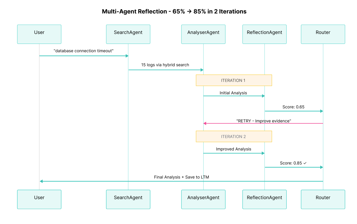 The diagram above shows the interaction between User, SearchAgent, AnalyserAgent, ReflectionAgent, and Elasticsearch during the 2 iterations. Observe how: