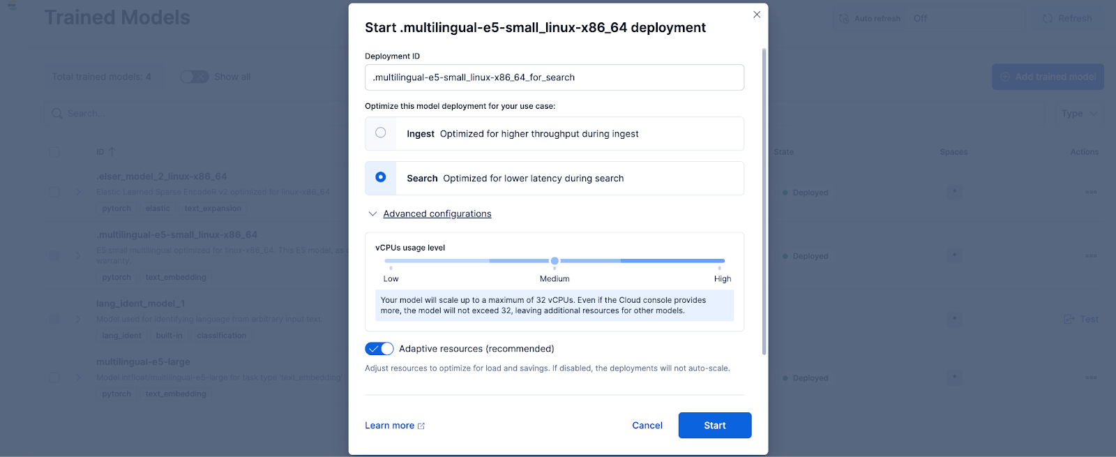 Navigieren Sie in Kibana zur Seite „Stack-Verwaltung > Trainierte Modelle“ und klicken Sie für das Modell „.multilingual-e5-small_linux-x86_64“ auf „Bereitstellen“ . Option. Dieses E5-Modell ist ein kleines, mehrsprachiges Gerät, das für linux-x86_64 optimiert ist und sofort einsatzbereit ist. Durch Klicken auf „Bereitstellen“ wird ein Bildschirm angezeigt, auf dem Sie die Bereitstellungseinstellungen oder vCPU-Konfigurationen anpassen können. Der Einfachheit halber verwenden wir die Standardoptionen mit der Auswahl adaptiver Ressourcen, wodurch unsere Bereitstellung je nach Nutzung automatisch skaliert wird.