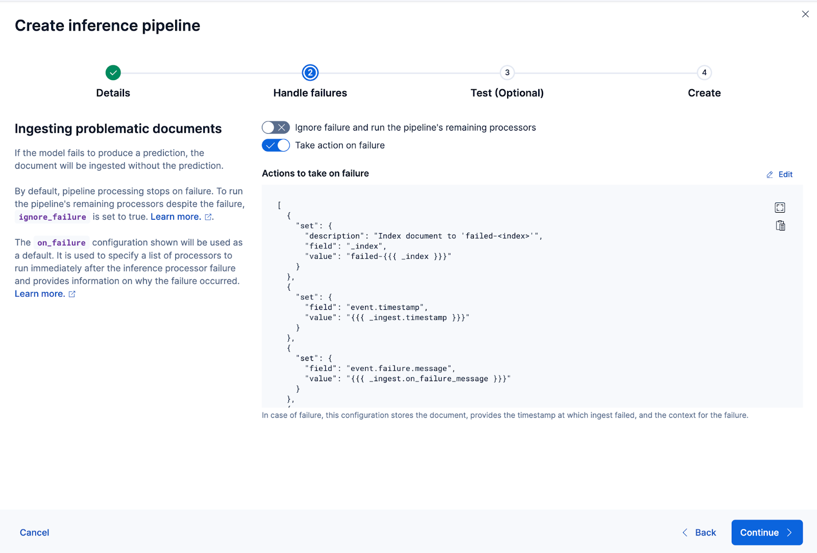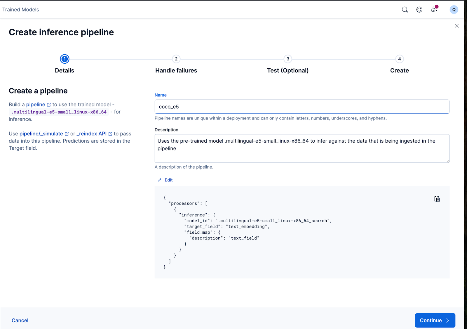 Das funktioniert hervorragend! Nun können wir mit der Erstellung der Ingest-Pipeline fortfahren und unsere Originaldokumente neu indizieren, sie durch die Pipeline leiten und einen neuen Index mit den Einbettungen erstellen. Dies erreichen Sie durch Klicken auf „Pipeline erstellen“. Sie werden dann durch den Erstellungsprozess der Pipeline geführt, wobei automatisch die benötigten Prozessoren zur Erstellung der Einbettungen bereitgestellt werden.