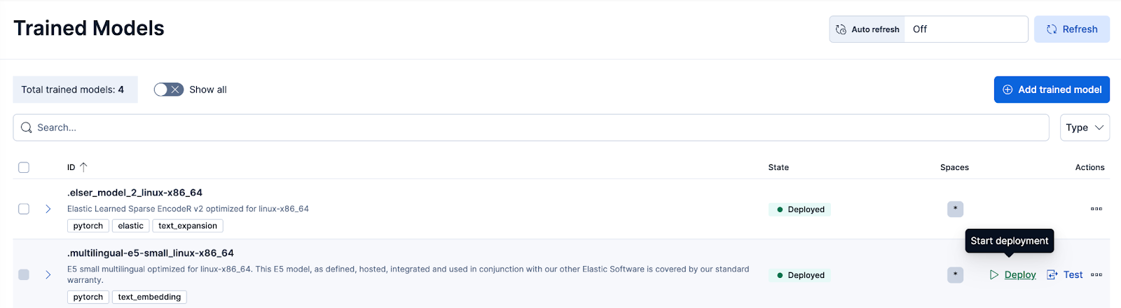 eland_import_hub_model --cloud-id $CLOUD_ID --es-api-key $ES_API_KEY --hub-model-id $HUB_MODEL_ID --es-model-id $MODEL_ID --task-type text_embedding --startNavigieren Sie anschließend zur Seite „Trainierte Modelle“, um das importierte Modell mit den gewünschten Konfigurationen bereitzustellen.