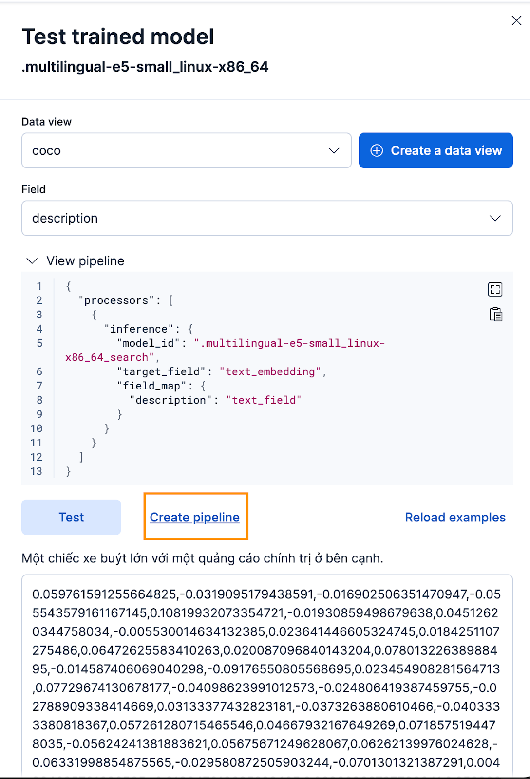 Um dies über die Kibana-Oberfläche zu tun, klicken Sie nach dem Bereitstellen des trainierten Modells auf die Schaltfläche „Testen “. Dies ermöglicht es Ihnen, die generierten Einbettungen zu testen und eine Vorschau anzuzeigen. Erstellen Sie eine neue Datenansicht für coco Index, Datenansicht auf die neu erstellte Coco-Datenansicht setzen und Feld auf description setzen, da dies das Feld ist, für das wir Einbettungen generieren möchten.