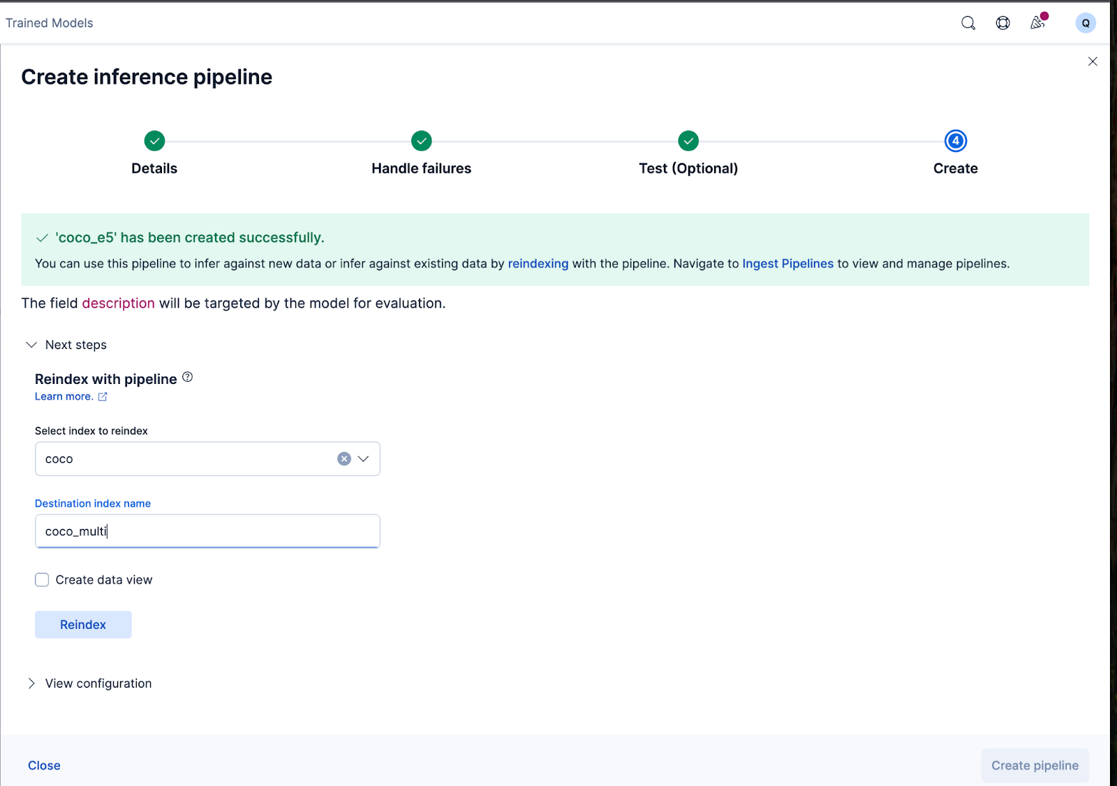Erstellen wir nun die Ingest-Pipeline. Ich nenne die Pipeline coco_e5. Sobald die Pipeline erfolgreich erstellt wurde, können Sie sie sofort verwenden, um die Einbettungen zu generieren, indem Sie die ursprünglich indizierten Daten im Assistenten in einen neuen Index umindizieren. Klicken Sie auf „Neu indizieren“ , um den Vorgang zu starten.