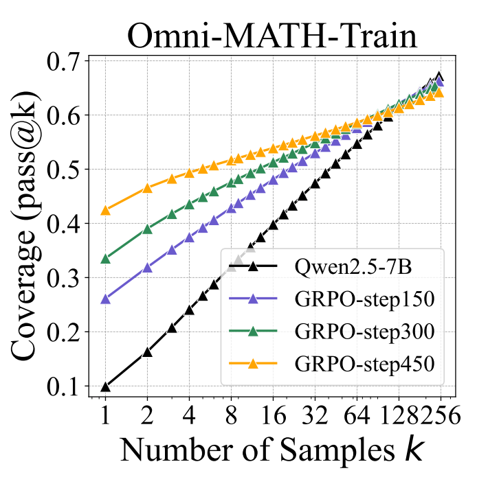 Accuracy as a function of the number of times the model iterated over its answer (labeled “k”), at different stages of training, for the baseline Qwen2.5-7B model and for the model trained using RLVR with the Group Relative Policy Optimization (GRPO) algorithm. From Figure 1 from the paper. This shows that RLVR training significantly improves the accuracy of the first try, but the benefits fall dramatically for multiple passes.