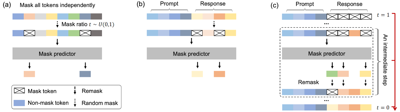 Overview of large language diffusion with masking (LLaDA), from Figure 2 of the paper. Original caption: (a) Pre-training. LLaDA is trained on text with random masks applied independently to all tokens at the same ratio t ∼ U[0, 1]. (b) SFT. Only response tokens are possibly masked. (c) Sampling. LLaDA simulates a diffusion process from t = 1 (fully masked) to t = 0 (unmasked), predicting all masks simultaneously at each step with flexible remask strategies.