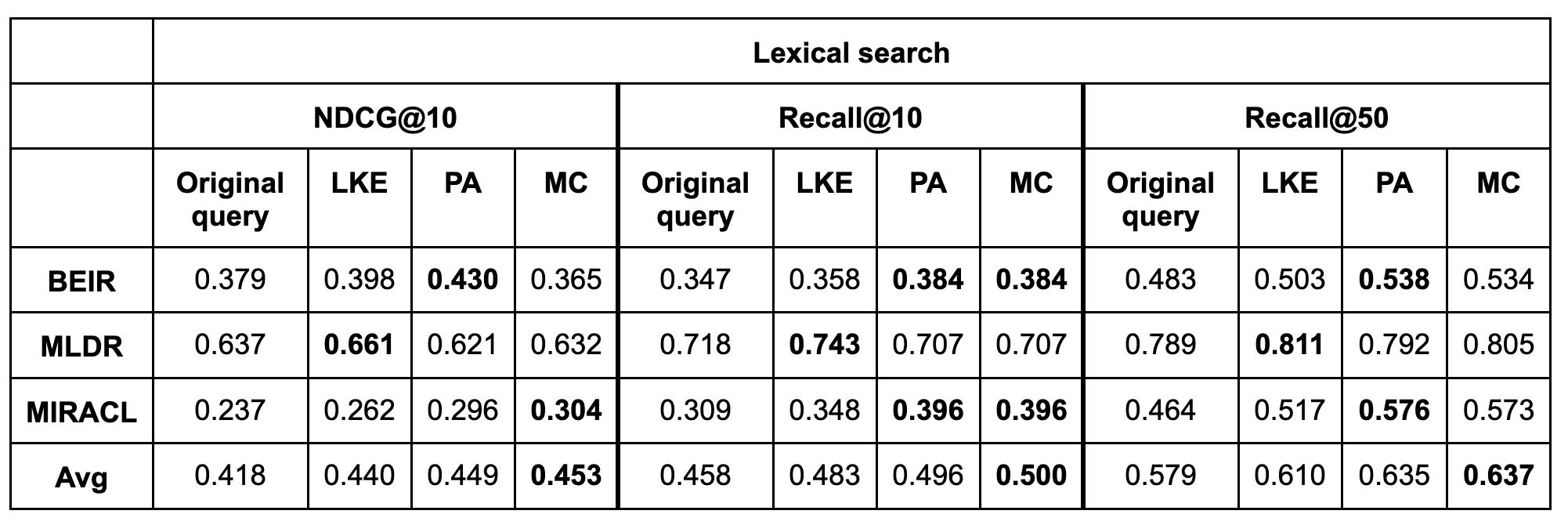 - LLMs are a good complement to improve lexical search: Using LLMs to enrich keywords or generate pseudo-answers provides consistent improvements in both relevance and recall for standard lexical retrieval.
