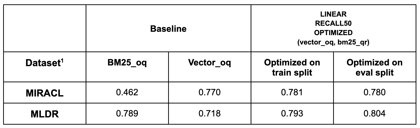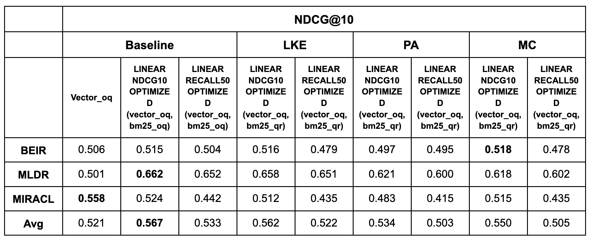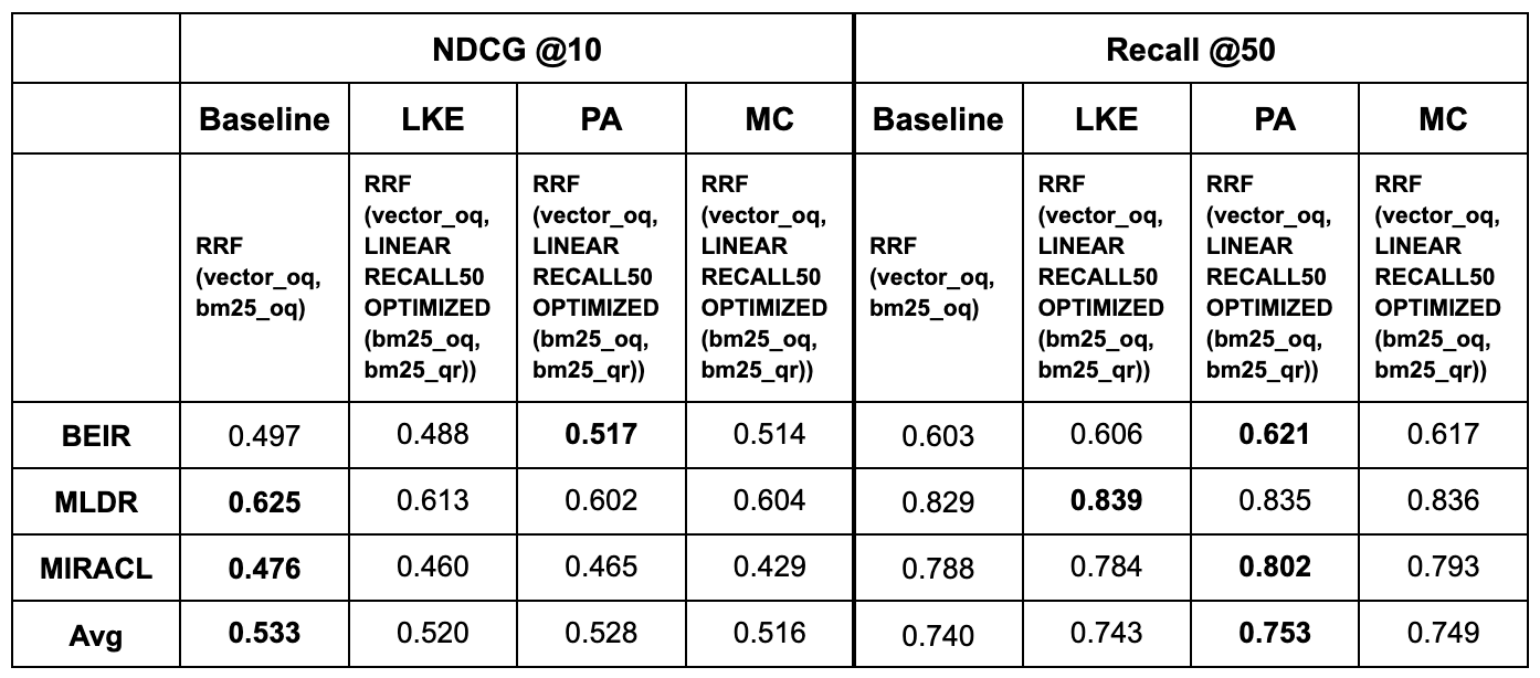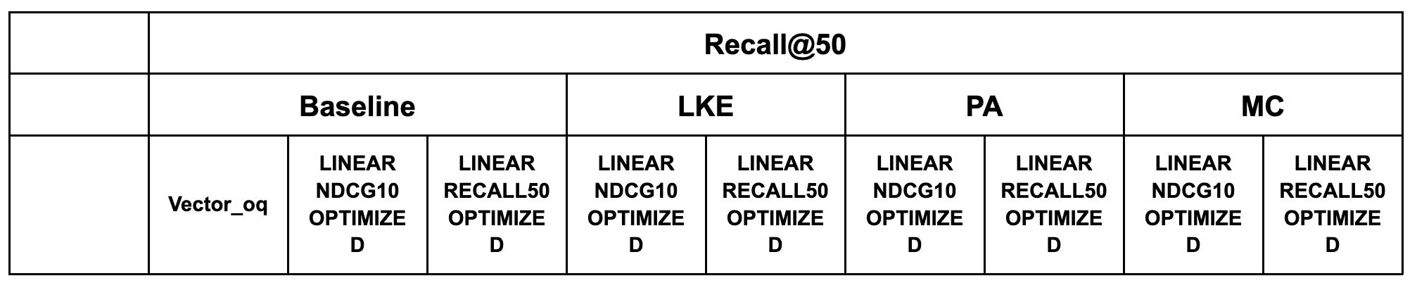 We denote this experiment RRF(vector_oq, LINEAR RECALL50 OPTIMIZED(bm25_oq, bm25_qr)). The same baseline as run in the previous table, RRF(vector_oq, bm25_oq), still provides a useful comparison in this experiment.