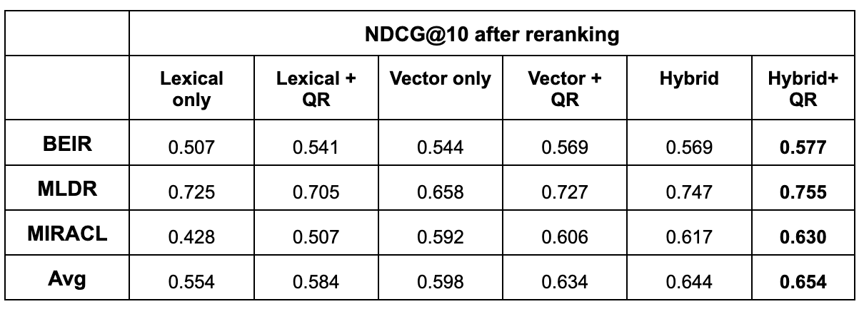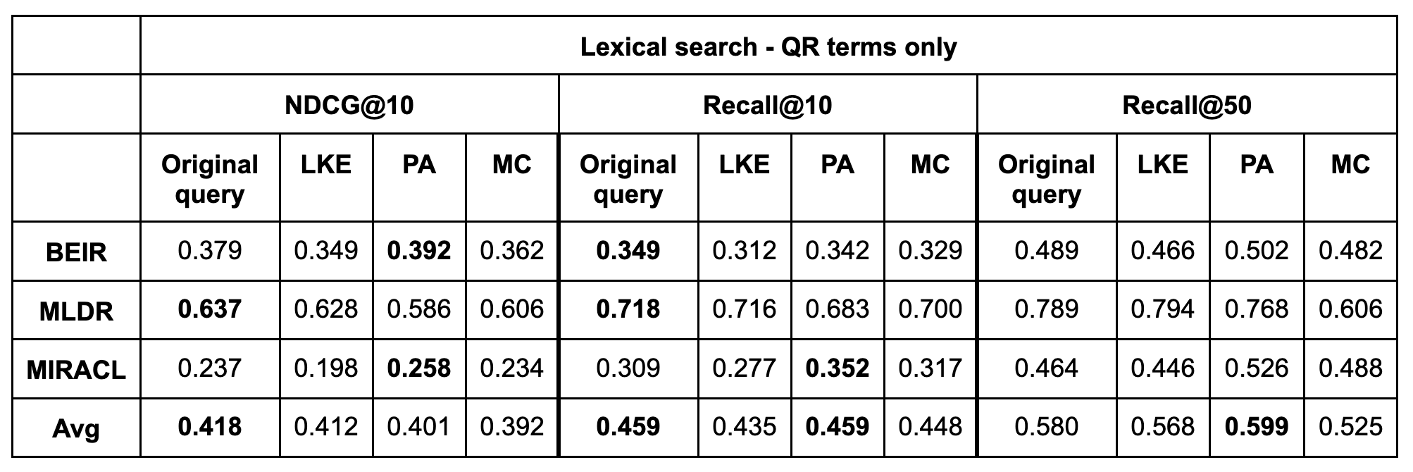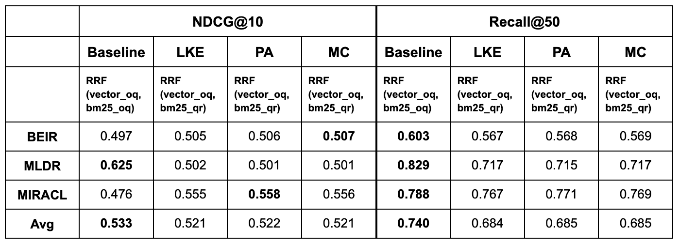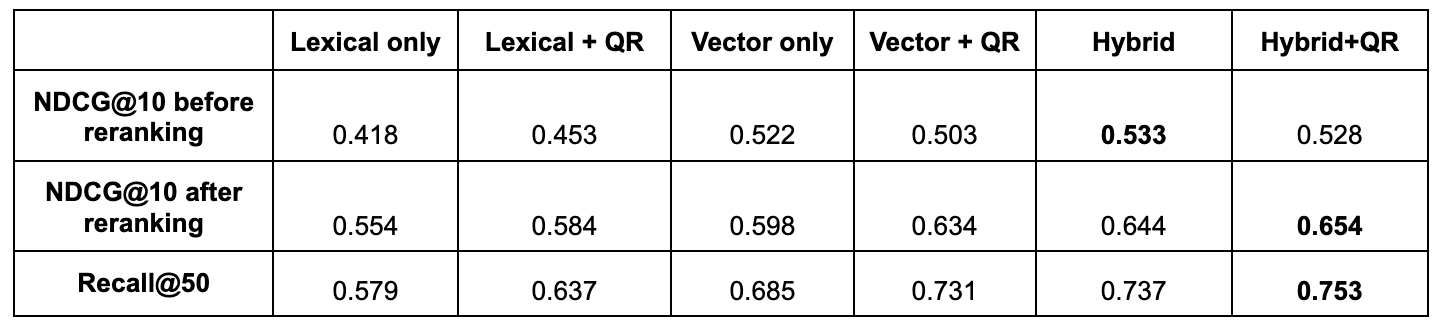 - Hybrid search is harder to beat: When using dense vector search or hybrid retrieval, simple query rewriting terms offer marginal gains. The best results come from using QR to boost existing hybrid scores rather than replacing them.