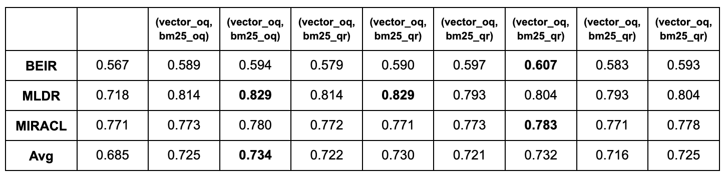 - Hybrid corresponds to the RRF (vector_oq, bm25_oq).