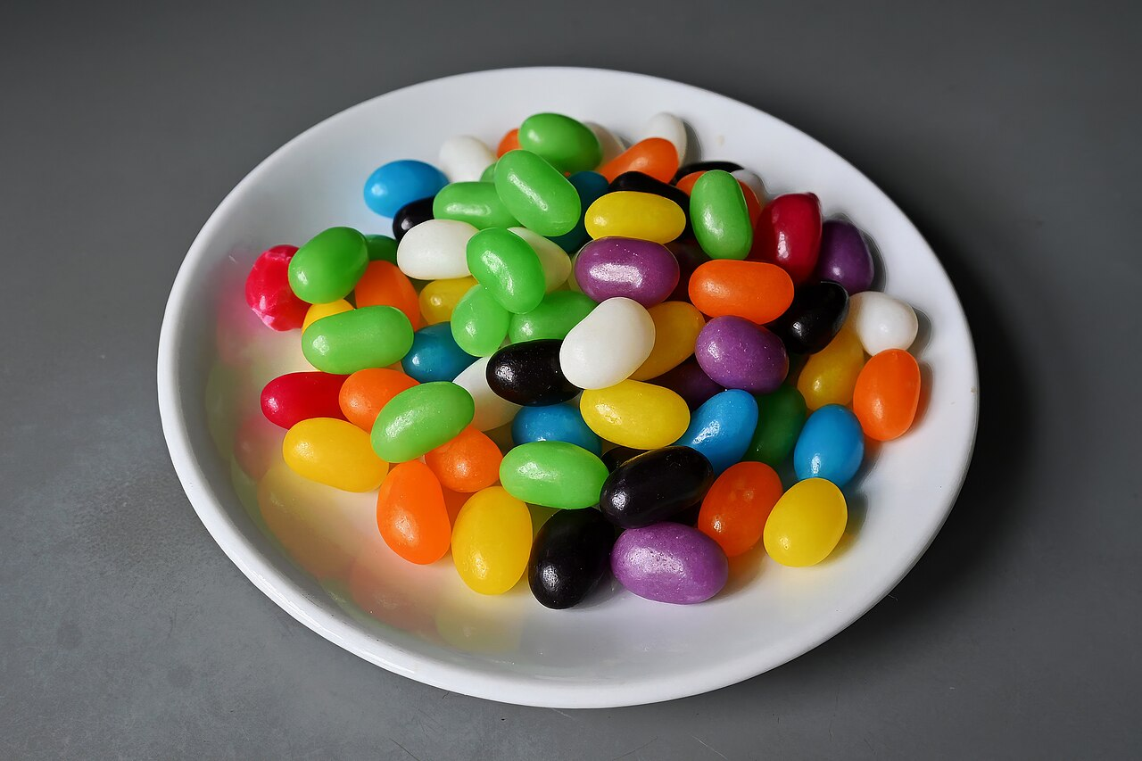 - Output: A white plate full of colorful jelly beans.